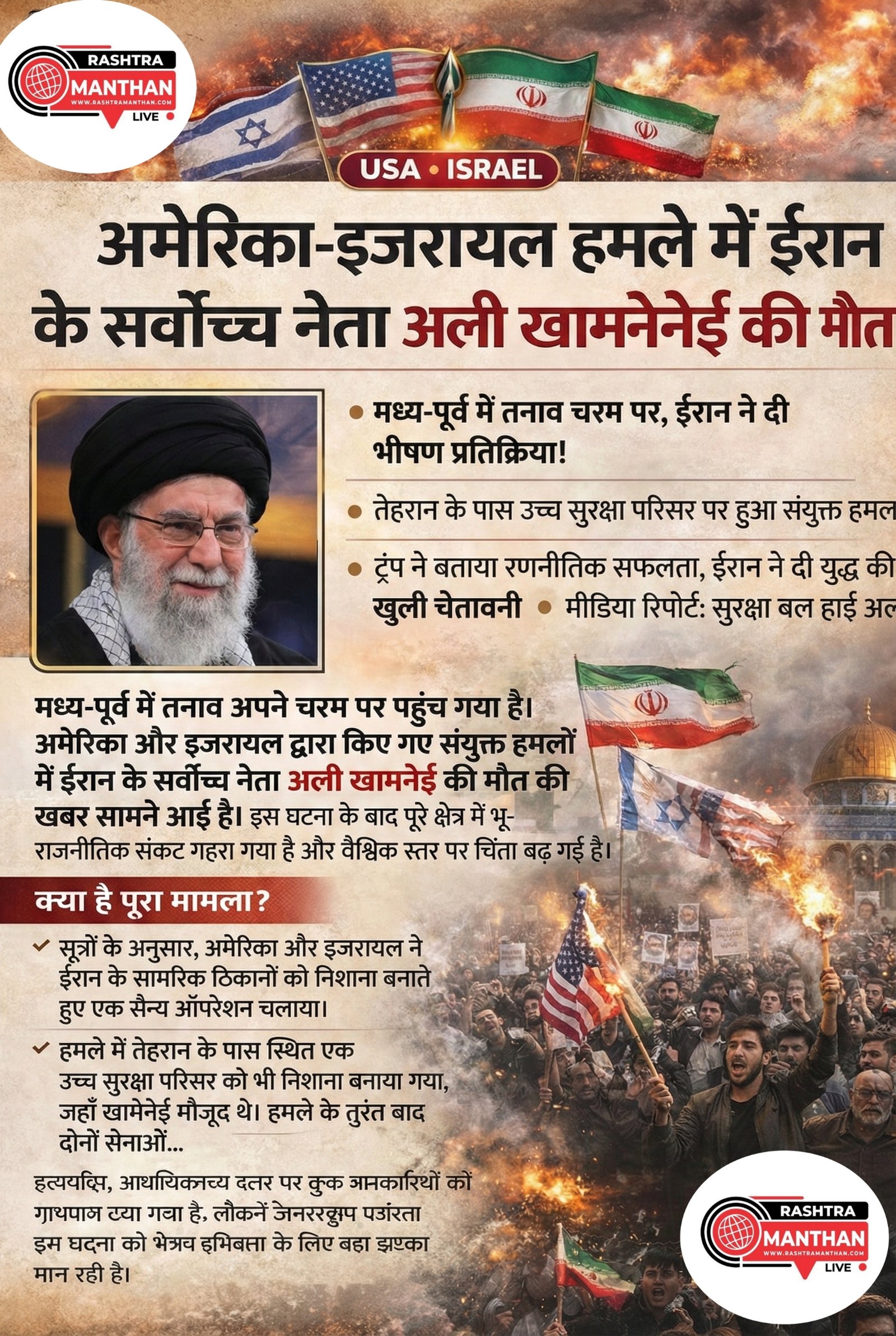 मध्य-पूर्व में तनाव अपने चरम पर पहुंच गया है। अमेरिका और इजरायल द्वारा किए गए संयुक्त हमले में ईरान के सर्वोच्च नेता Ali Khamenei की मौत की खबर सामने आई है। इस घटना के बाद पूरे क्षेत्र में भू-राजनीतिक संकट गहरा गया है और वैश्विक स्तर पर चिंता बढ़ गई है।