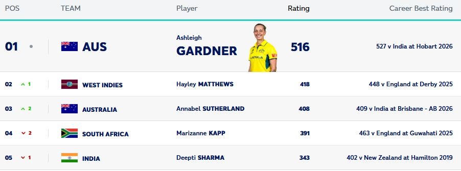 वहीं ऑलराउंडर खिलाड़ियों की रैंकिंग में ऑस्ट्रेलिया की एशले गार्डनर का दबदबा कायम है। उन्होंने अपने ऑलराउंड प्रदर्शन से टीम को कई मैचों में जीत दिलाने में अहम भूमिका निभाई है। गार्डनर लंबे समय से ऑलराउंडर रैंकिंग में लगातार शीर्ष स्थान बनाए हुए हैं।