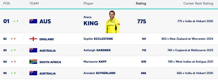 ऑस्ट्रेलियाई स्पिनर अलाना किंग ने अपनी बेहतरीन गेंदबाजी के दम पर गेंदबाजों की रैंकिंग में पहला स्थान हासिल किया है। हाल के मैचों में उनकी लगातार प्रभावशाली गेंदबाजी ने उन्हें रैंकिंग में बड़ा फायदा दिलाया। दूसरी ओर भारतीय टीम की उपकप्तान स्मृति मंधाना ने अपनी शानदार बल्लेबाजी के चलते बल्लेबाजों की रैंकिंग में शीर्ष स्थान पर कब्जा जमाया है।