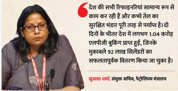 एलपीजी आपूर्ति को लेकर मंत्रालय ने कहा कि देश में किसी भी डिस्ट्रीब्यूटर के पास कमी नहीं है। पिछले दो दिनों में करीब 1.04 करोड़ LPG बुकिंग दर्ज हुईं, जिनके मुकाबले 92 लाख सिलेंडरों की डिलीवरी की जा चुकी है। पारदर्शिता बढ़ाने के लिए 95% बुकिंग ऑनलाइन हुईं, जबकि 82% डिलीवरी ऑथेंटिकेशन कोड के जरिए सत्यापित की गईं।
