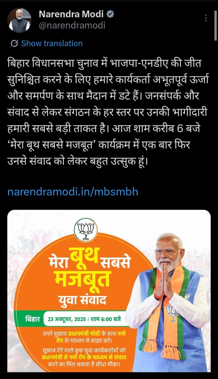 प्रधानमंत्री ने अपने सोशल मीडिया हैंडल पर साझा किया कि बिहार विधानसभा चुनाव में भाजपा-एनडीए की जीत के लिए कार्यकर्ताओं की ऊर्जा और समर्पण ही सबसे बड़ी ताकत है। वे आज शाम ‘मेरा बूथ सबसे मजबूत’ कार्यक्रम के जरिए कार्यकर्ताओं से जुड़ेंगे। इससे पहले 15 अक्टूबर को भी उन्होंने एनडीए कार्यकर्ताओं के साथ सीधे संवाद किया था।